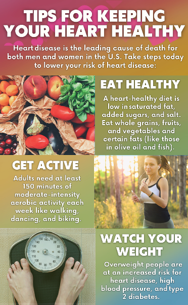 Purpose: Designed to be appealing and easy to understand, this infographic provides heart health tips like eating well, exercising, and managing stress.