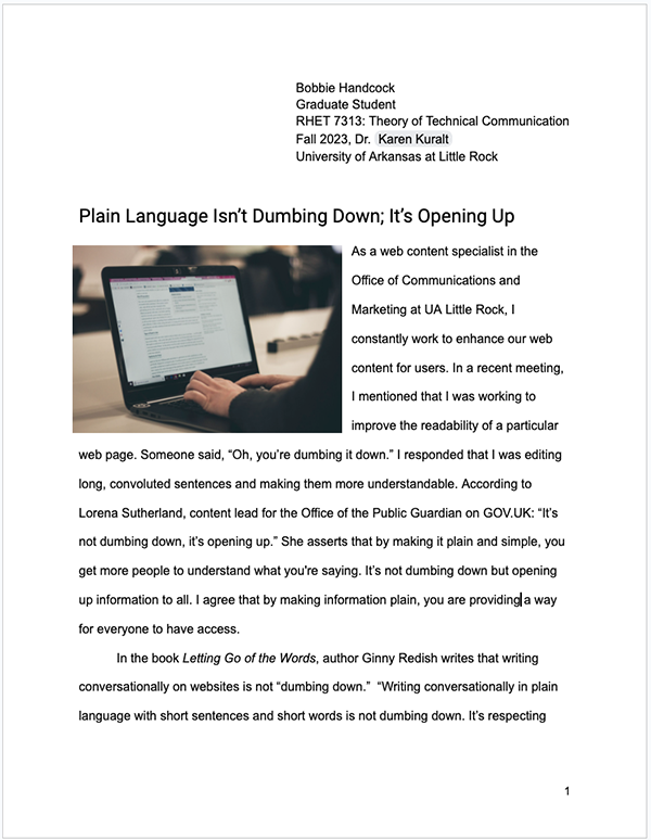 Audience: The audience is anyone interested in learning about plain language. This paper is written in a blog-style format using techniques I learned in Document Design and Advanced Editing.